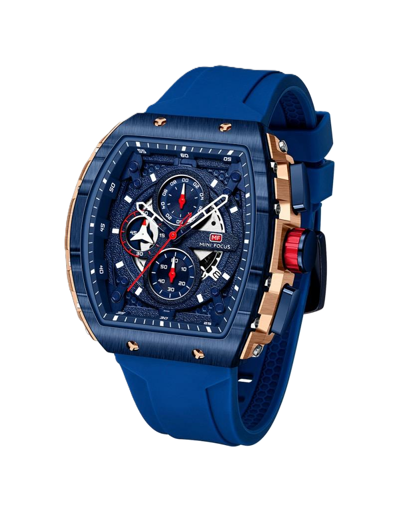 A sporty timepiece with a vibrant blue design and flexible rubber strap. Built for comfort and active lifestyles.